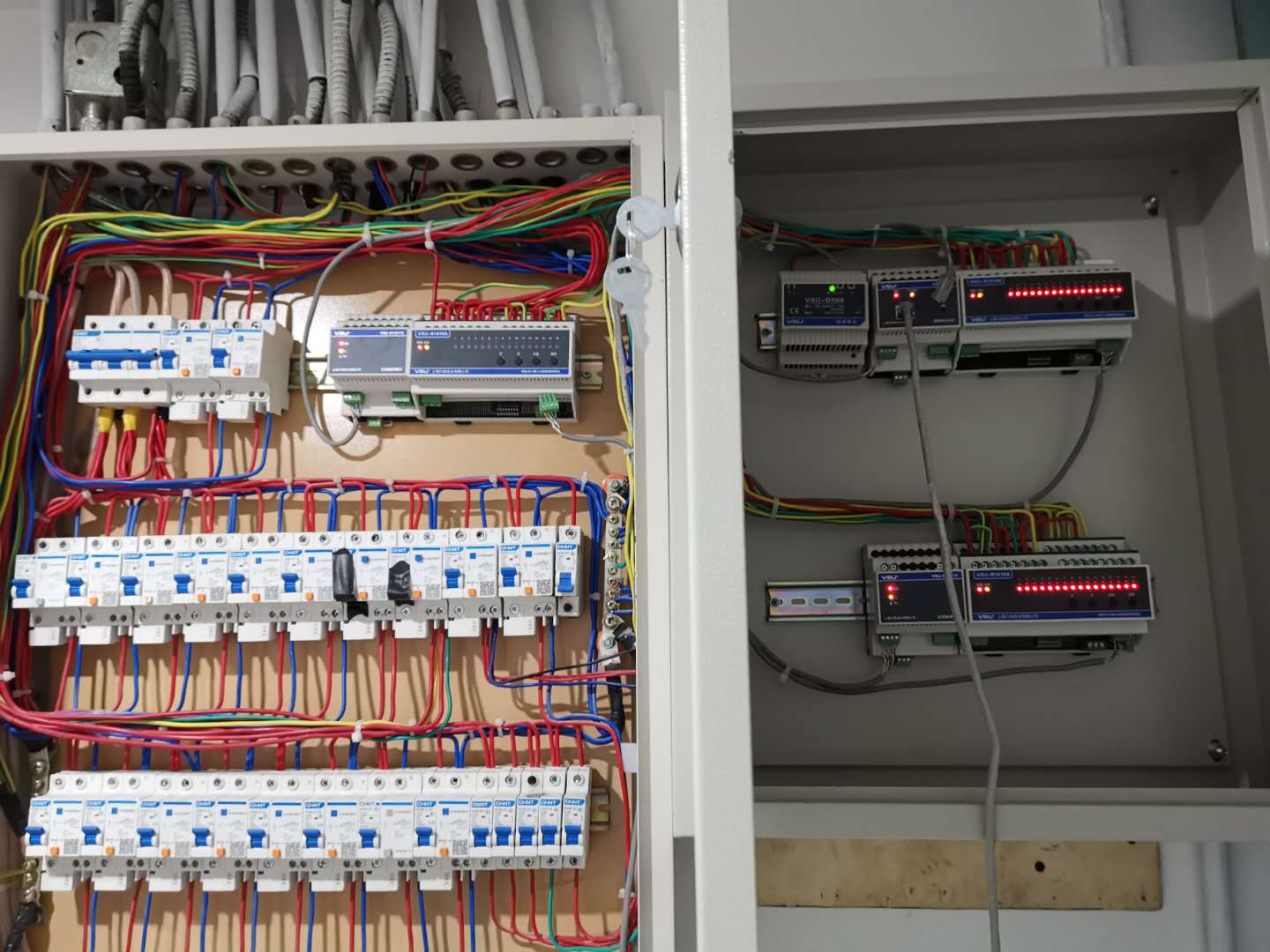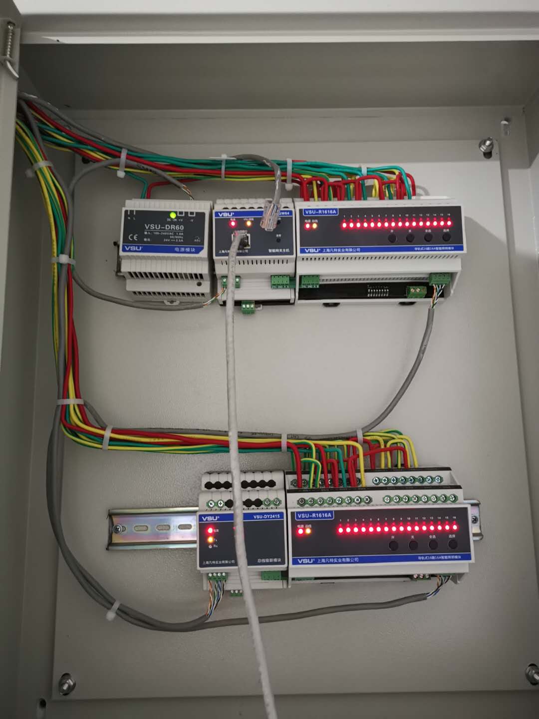 采用VSU總線型成套產(chǎn)品:智能網(wǎng)關(guān)主機(jī)控制整體,接受到手機(jī)或面板的指令輸送到開關(guān)執(zhí)行模塊進(jìn)行遠(yuǎn)程開關(guān)燈操作,采用的照明模塊是16路16A的,搭配DR60電源模塊、級聯(lián)模塊確保供電充沛??偩€的特點(diǎn)是連產(chǎn)品的調(diào)試檢測都不需要到現(xiàn)場,遠(yuǎn)程即可將其調(diào)試就位。這個項目甚至連我司技術(shù)人員遠(yuǎn)程協(xié)助都不需要自己就安裝完成,可見其有多便于安裝,加上連接片用于串聯(lián)模塊,不是專業(yè)人員也可自主安裝使用。