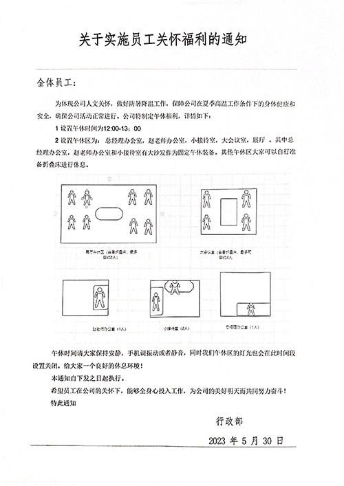 公司設(shè)置了午休區(qū)并購置了"午休神器",神器寬大柔軟,如折疊睡墊;配備的緩解頸部勞累的充氣枕,釋放了上午工作的疲勞。讓員工在午休時(shí)間休息好,養(yǎng)足精神,不是一件小事。該通知讓員工感受到了企業(yè)大家庭的溫暖,也是企業(yè)人文關(guān)懷的真情體現(xiàn),獲得大家的一致好評點(diǎn)贊,也使得下午的工作更加投入用心。
