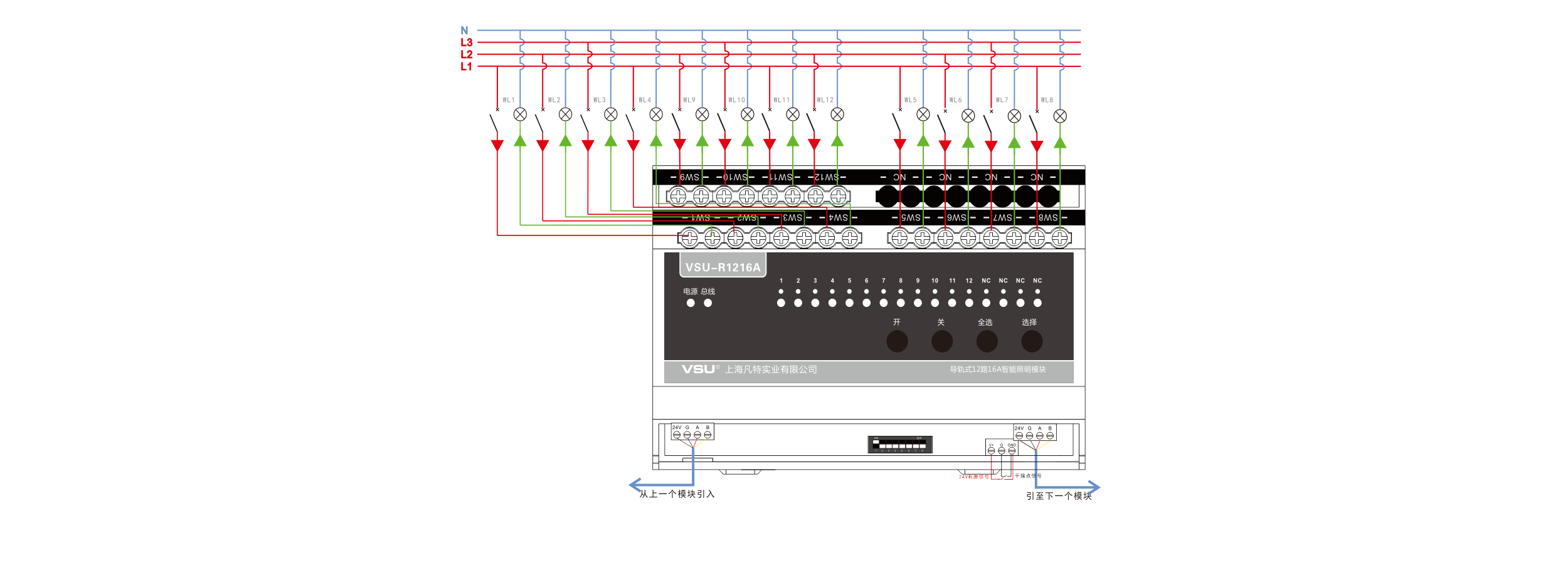 本產品為導軌式安裝,含12路智能繼電器,每回路可獨立控制3520W燈具的開關,帶應急按鍵,LED燈實時指示各個回路開關狀態(tài),可設置為互鎖控制6組窗簾開合; |